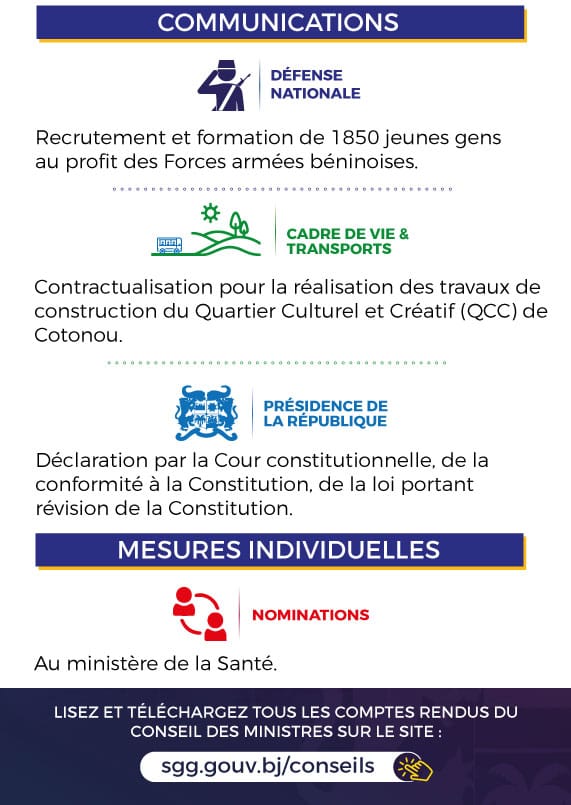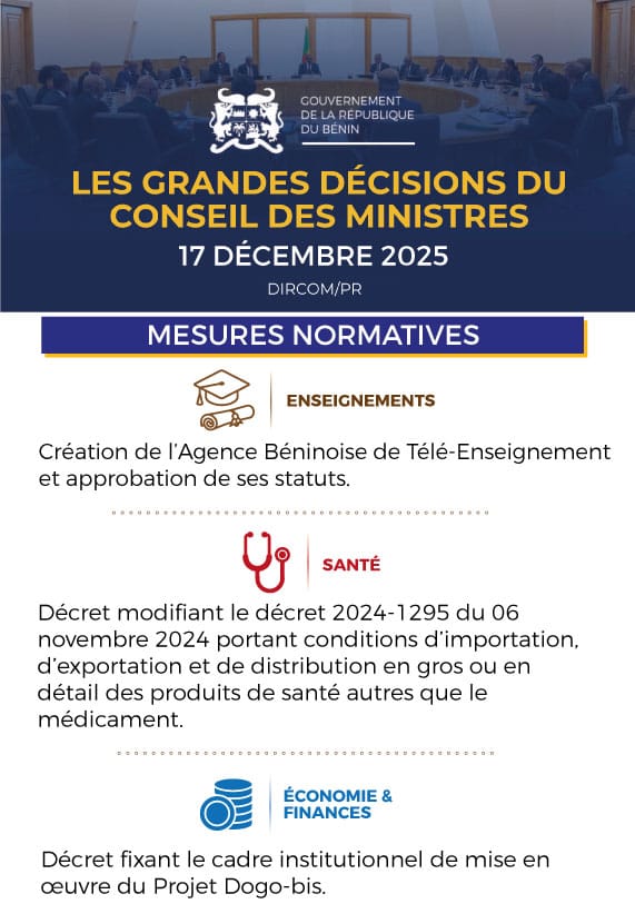 Le conseil des ministres s’est réuni ce mercredi 17 décembre 2025 sous la présidence du Chef de l’État, chef du gouvernement Patrice Talon. À l’occasion plusieurs décisions ont été prises dont voici les grandes lignes.