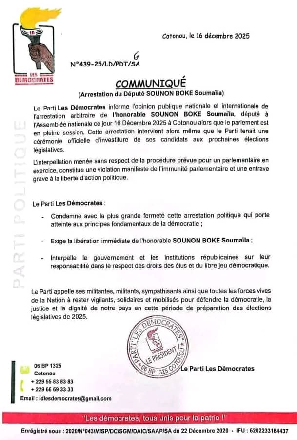Le député Sounon Boke Soumaïla, membre du parti Les Démocrates (LD) a été interpellé ce mardi 16 décembre 2025. Dans un communiqué rendu public, la formation politique de l’opposition affirme que l’élu a été arrêté à Cotonou, en pleine session parlementaire. Selon le parti Les Démocrates, cette interpellation est intervenue alors même que la formation tenait une cérémonie officielle d’investiture de ses candidats aux prochaines élections législatives. Le parti dénonce une arrestation qu’il qualifie « d’arbitraire » et estime que la procédure prévue pour un parlementaire en exercice n’a pas été respectée.Dans le document signé par sa direction, Les Démocrates évoquent une violation manifeste de l’immunité parlementaire et parlent d’une entrave grave à la liberté d’action politique. Le parti condamne avec fermeté ce qu’il considère comme une arrestation à caractère politique et exige la libération immédiate du député concerné. Tout en interpellant le gouvernement et les institutions de la République sur leur responsabilité dans la préservation des droits des élus, le parti appelle ses militants, sympathisants et l’ensemble des forces vives de la Nation à rester vigilants, solidaires et mobilisés pour la défense de la démocratie, de la justice et de la dignité nationale, à l’approche des législatives de 2025.