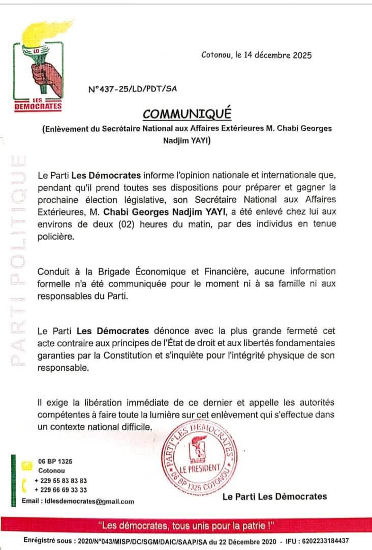 Chabi Yayi est le secrétaire aux relations extérieures. Suite à son arrestation, il a été conduit dans les locaux de la Police Judiciaire. Aux environs de 13 heures, il a été rejoint par ses avocats dans les locaux de la police judiciaire où il était en attente de son audition. Par ailleurs, son parti politique, Les Démocrates, a publié un communiqué dans lequel il dénonce une arrestation arbitraire. (Lire ci-dessous)