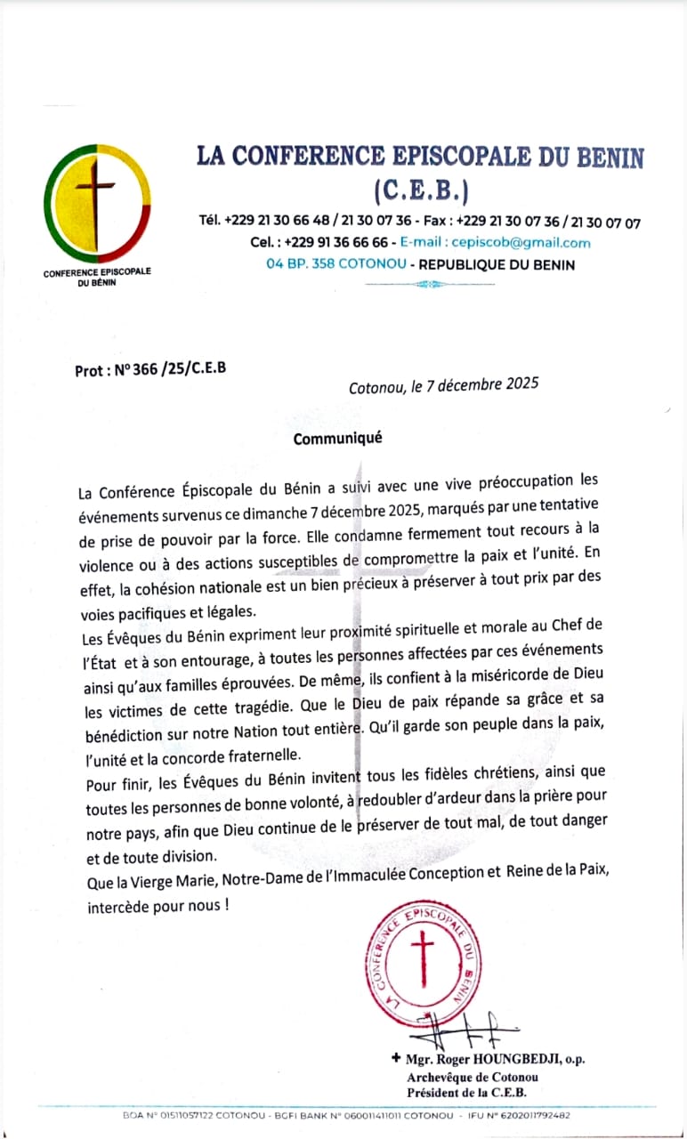 Dans un communiqué reconnaissant la gravité de la situation, la Conférence Épiscopale du Bénin condamne fermement la tentative de prise de pouvoir par la force survenue ce dimanche 07 décembre 2025. Elle exhorte les béninois à préserver la paix par des moyens légaux et invite les fidèles à intensifier leurs prières pour la stabilité du pays.