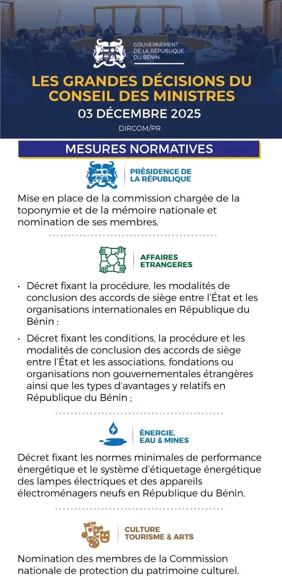 Le conseil des ministres s’est réuni ce mercredi 03 décembre 2025 sous la présidence du Chef de l’État, chef du gouvernement Patrice Talon. À l’occasion plusieurs décisions ont été prises dont voici les grandes lignes.