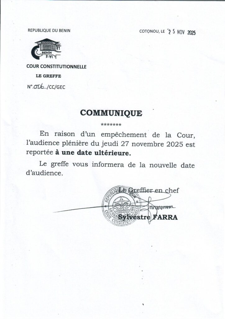 Initialement prévue pour ce jeudi 27 novembre 2025, l’audience plénière de la Cour constitutionnelle du Bénin n’aura finalement pas lieu. Dans un communiqué daté du 25 novembre, elle a informé le public du report de cette séance à une date qui sera communiquée ultérieurement.
