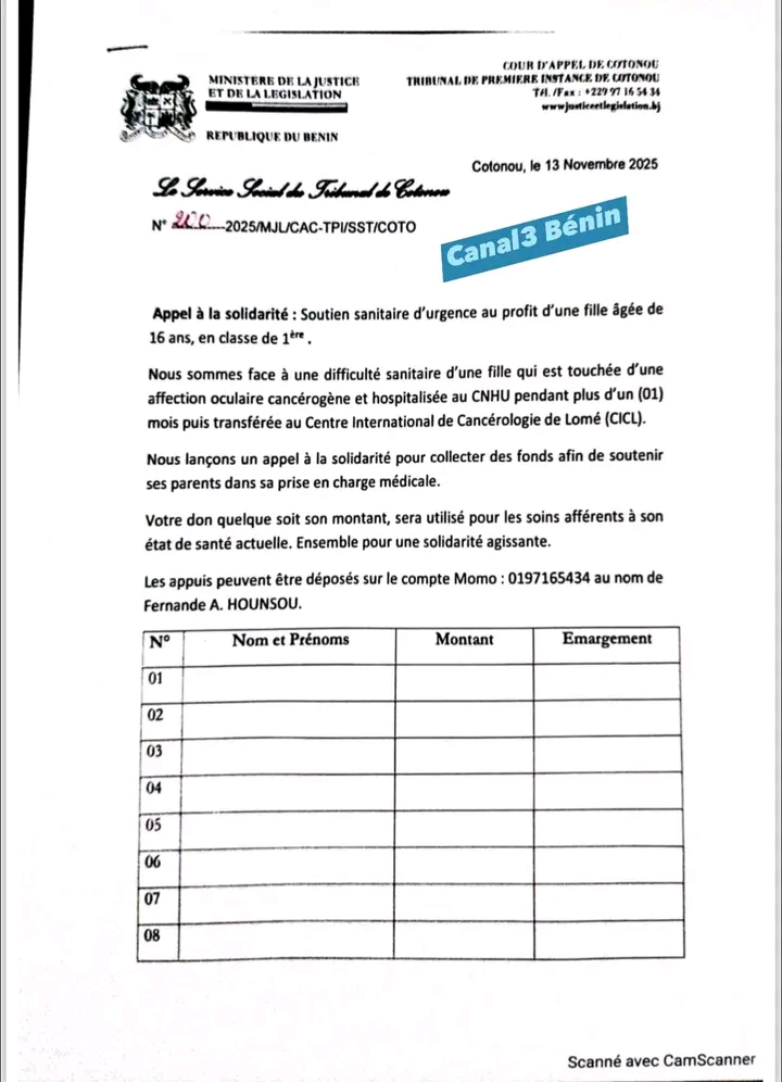 Le tribunal de première instance de Cotonou a été victime d’une imposture qui circule depuis quelques heures sur les réseaux sociaux. Un appel à dons, présenté comme émanant de madame Fernande Hounsou, soi‑disant assistante sociale et chef du service social de la juridiction, a été diffusé sur plusieurs plateformes. Le message, orné d’un en‑tête imitant celui du tribunal, invite les internautes à verser de l’argent, sous prétexte d’une action caritative liée à l’institution.