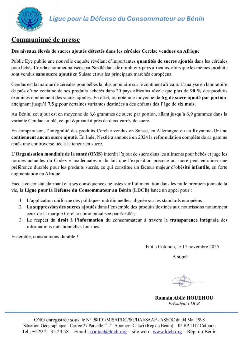 Face à cette situation, la Ligue pour la Défense du Consommateur au Bénin demande que les produits vendus ici respectent les mêmes règles que ceux vendus en Europe. Elle veut que Nestlé retire le sucre ajouté de ses bouillies pour bébés et que les informations sur les emballages soient plus claires. Pour elle, tous les bébés doivent avoir droit à une alimentation saine, peu importe le pays où ils vivent.