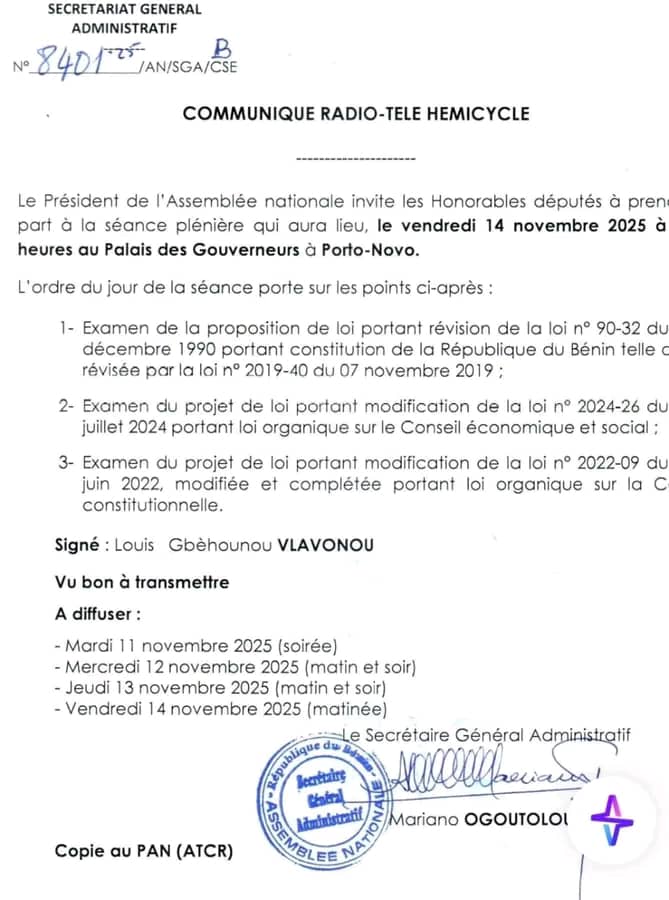 Le président de l’Assemblée nationale, Louis Vlavonou, a convoqué les députés pour une séance plénière ce vendredi 14 novembre 2025 au Palais des Gouverneurs à Porto-Novo. Selon le communiqué publié, les députés auront à examiner trois textes importants lors de cette session. A l’ordre du jour figure la proposition de révision de la Constitution du 11 décembre 1990, déjà modifiée en 2019. En deuxième position, les députés examineront un projet de modification de la loi organique sur le Conseil économique et social, adoptée en juillet 2024. Enfin, le troisième texte à étudier concerne la loi organique régissant la Cour constitutionnelle.