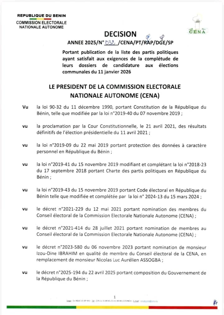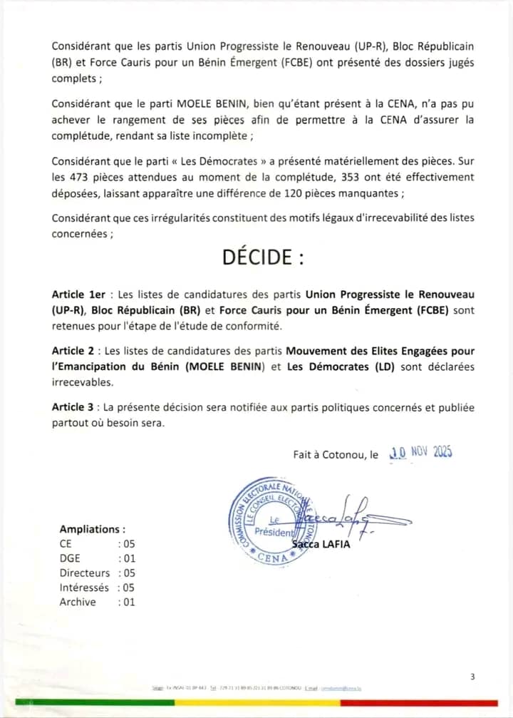 La Commission électorale nationale autonome (CENA) a rejeté les candidatures du parti Les Démocrates (LD) et de Moele-Bénin pour les élections communales du 11 janvier 2026. La décision a été rendue publique ce lundi 10 novembre 2025 et signée par le président Sacca Lafia.Le dossier de Moele-Bénin a été jugé incomplet. Les Démocrates ont fourni 353 documents sur 473 exigés, soit 120 pièces manquantes. Ces lacunes constituent des motifs légaux d’irrecevabilité selon la CENA. Par contre, les candidatures de l’Union Progressiste le Renouveau (UP-R), du Bloc Républicain (BR) et des Forces Cauris pour un Bénin Émergent (FCBE) ont été validées pour le scrutin.