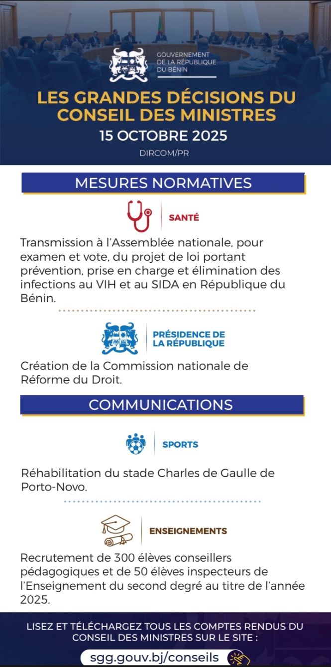 Le Conseil des Ministres du Bénin s’est réuni ce mercredi 15 octobre 2025 sous la présidence du Président Patrice Talon. Plusieurs décisions importantes ont été prises lors de cette séance. Voici les grandes lignes :