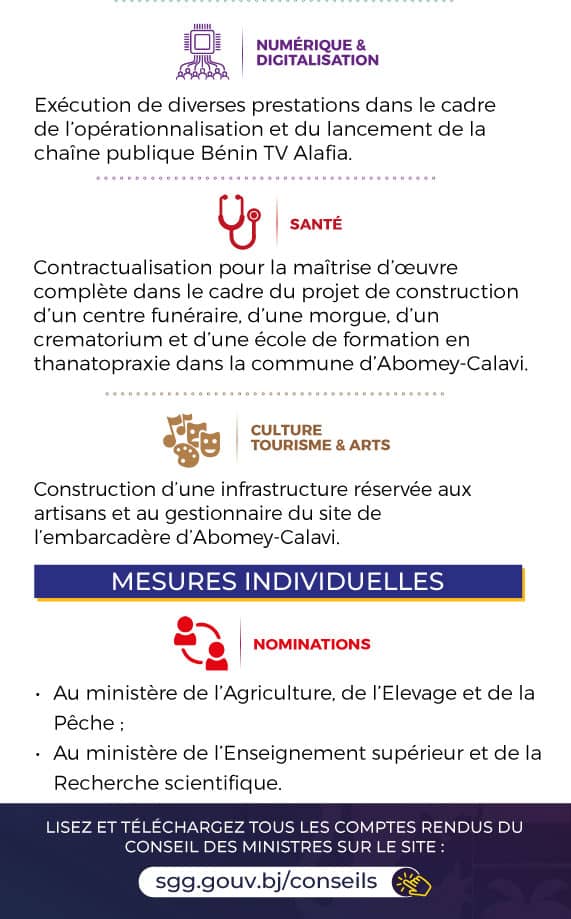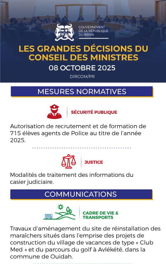 Le Conseil des Ministres du Bénin s’est réuni ce mercredi 08 octobre 2025 sous la présidence du Président Patrice Talon. Plusieurs décisions importantes ont été prises lors de cette séance. Voici les grandes lignes :