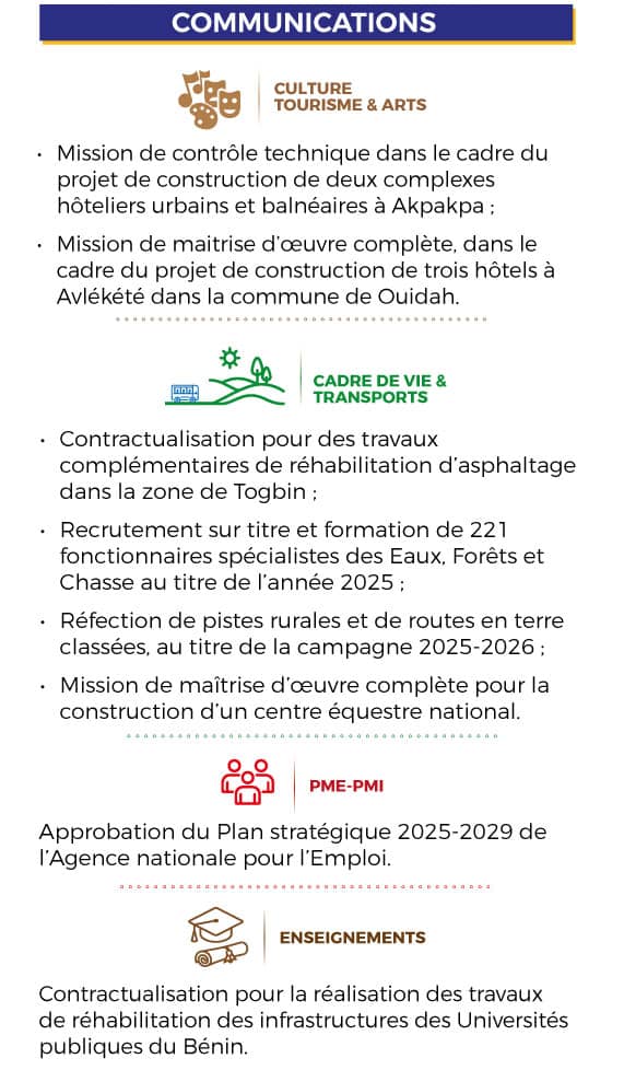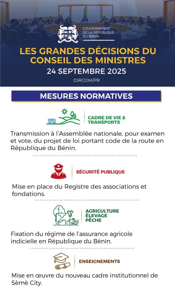 Le Conseil des Ministres du Bénin s’est réuni ce mercredi 24 septembre 2025 sous la présidence du Président Patrice Talon. Plusieurs décisions importantes ont été prises lors de cette séance. Voici les grandes lignes :