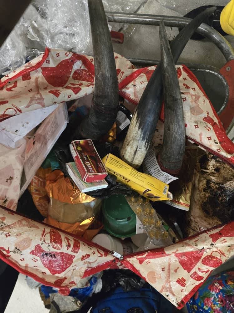Dans une deuxième publication de la Douane, on voit des photos d’objets considérés comme des fétiches contenus dans des valises appartenant au sieur HOUNYE HOUNGBONON Dominique. Il était à bord du vol Camair Co en provenance de Cotonou le samedi 20 septembre 2025. L’interpellation a eu lieu vers 02 heures du matin.