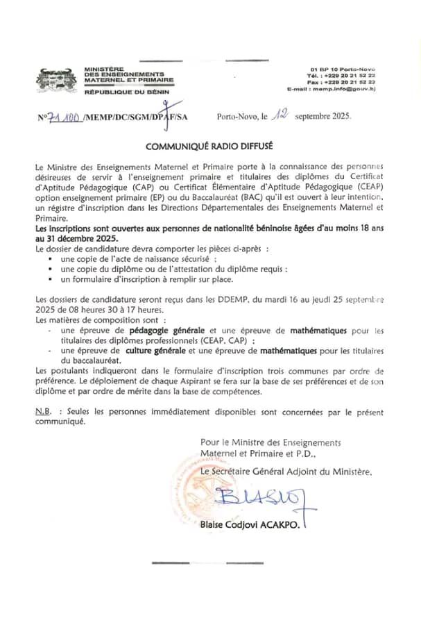 Le communiqué, signé par Blaise Codjovi ACAKPO, Secrétaire général adjoint du ministère, précise les modalités de participation et appelle les intéressés à se conformer aux délais et aux critères établis.