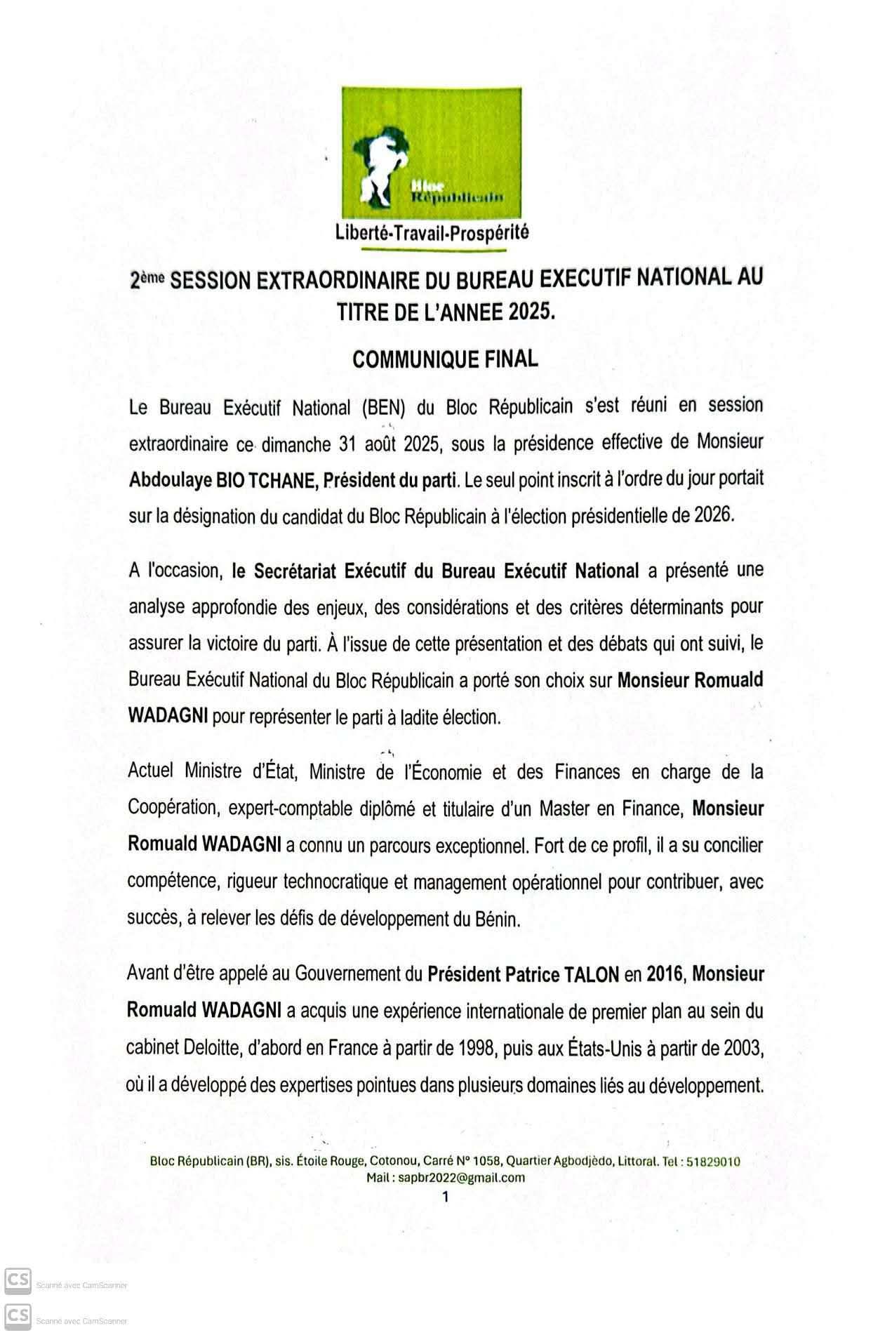 Les voix s’élèvent pour soutenir la candidature de Romuald Wadagni. Après le président du parti Up le Renouveau, Joseph Fifamè Djogbénou et de la presidente de la RN, Claudine Prudencio, qui ont approuvé cette candidature, le Bloc Républicain les officiellement suivis à travers une déclaration. Le parti du Ministre du Plan et du développement, Abdoulaye Bio Tchané a officialisé la candidature de l’argentier national.Lire le communiqué ci-dessous.