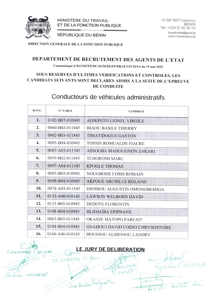 Finie l’attente! Les candidats au concours de recrutement de 172 agents conducteurs de véhicules au profit du Ministère de l’économie et des finances sont fixés sur leur sort. Le Ministère dela Fonction publique a publié la liste de ceux qui sont déclarés admis dans l’après midi de ce 21 août 2025. Voir liste ci-dessous.