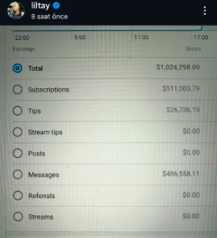 Lil Tay, influenceuse canadienne, a lancé son compte OnlyFans le 2 août 2025, quelques heures après avoir atteint la majorité. Elle affirme avoir gagné plus d’un million de dollars en trois heures. La somme provient des abonnements, des messages privés payants et des pourboires. Elle a publié, sur Instagram, une capture d’écran qui montre ses revenus estimés à environ 890 000 euros, dont 444 000 euros en abonnements et 423 000 euros en messages privés, avec 22 500 euros de pourboires.