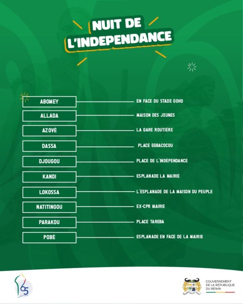 Dans le cadre de la célébration du 65è anniversaire de l’indépendance du Bénin, le Ministère du Tourisme, de la Culture et des Arts organise la « Nuit de l’Indépendance ». Cette grande fête culturelle se tient ce 31 juillet 2025 dans 10 villes du pays, à savoir : Abomey, Allada, Azovè, Dassa, Djougou, Kandi, Lokossa, Natitingou, Parakou et Pobè. Plus de 200 artistes ont été sollicités pour animer cette soirée exceptionnelle, qui promet d’être inoubliable. Au programme, des concerts live, du théâtre et une ambiance festive garantie. Les Béninois et les amoureux de la culture béninoise sont invités à se joindre à cette célébration pour vivre des moments inoubliables. La « Nuit de l’Indépendance » est une occasion pour le Bénin de mettre en valeur sa richesse culturelle et de célébrer sa liberté.