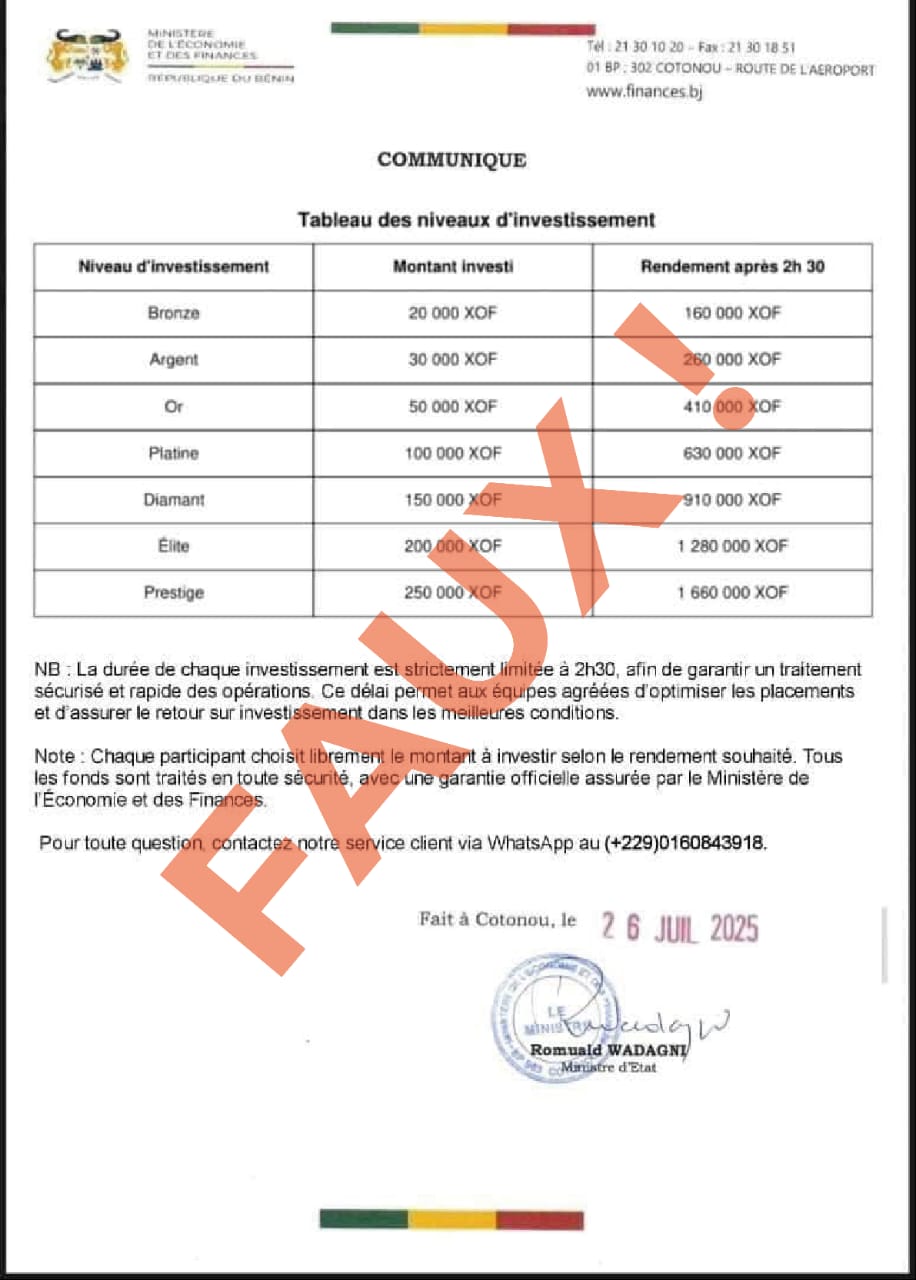 Le Centre National d’Investigations Numériques (CNIN) invite la population à la vigilance concernant des documents qui circulent depuis quelques heures et faisant la promotion d’une prétendue opportunité d’investissements sur de la cryptomonnaie. Le CNIN tient à informer que ce document usurpe faussement l’identité du Ministère de l’Économie et des Finances, dans le but d’escroquer.