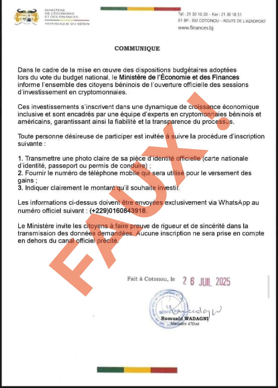 Ces derniers jours, des documents circulent en ligne et font la promotion d’une prétendue opportunité d’investissements sur de la cryptomonnaie. Ce lundi 28 juillet 2025, le CNIN a qualifié ces documents de «faux» et alerte la population à faire preuve de vigilance.