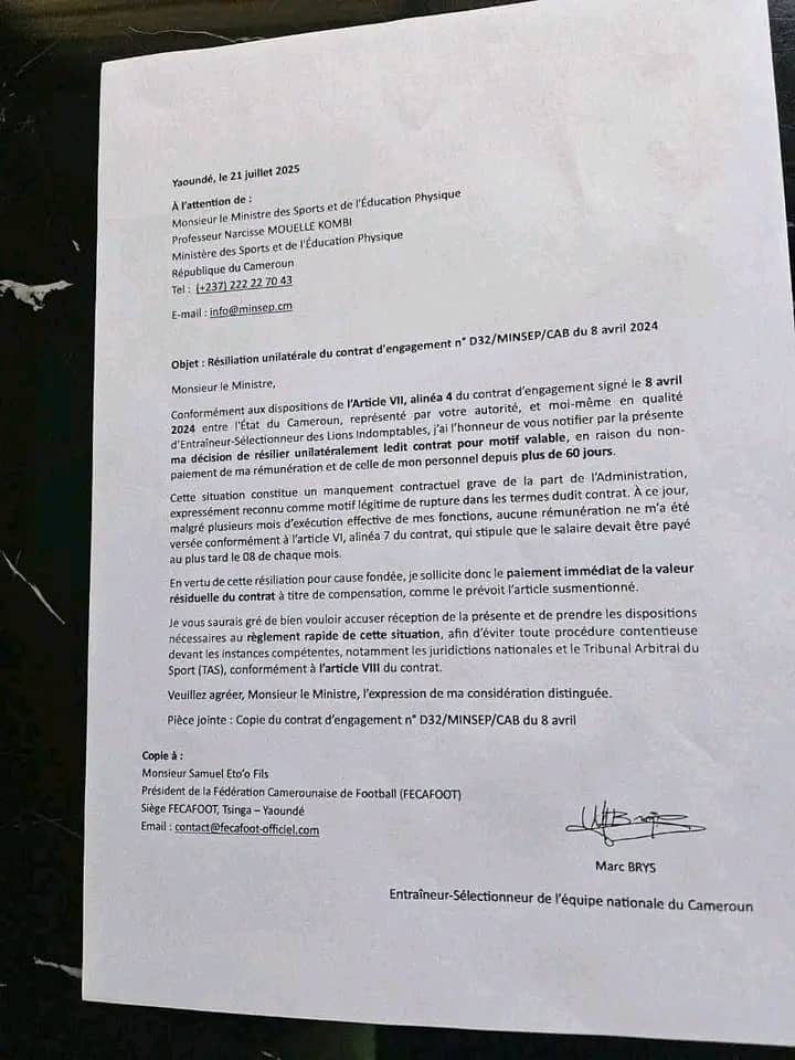 Dans une lettre explosive adressée au ministre des Sports, Narcisse Mouelle Kombi, le lundi 21 juillet 2025, Marc Brys, l’entraîneur-sélectionneur des Lions Indomptables au Cameroun, annonce la résiliation unilatérale de son contrat d’engagement. La raison invoquée est le non-paiement de sa rémunération depuis plus de 60 jours, ce qui constitue une violation grave des engagements contractuels selon lui. Brys réclame désormais le paiement immédiat de la valeur résiduelle du contrat, sous peine de saisir le Tribunal Arbitral du Sport (TAS). Cette décision intervient après des mois de tension entre l’entraîneur et l’administration. Les conséquences de cette résiliation pourraient être importantes pour l’équipe nationale. Reste à savoir comment les autorités réagiront à cette crise.