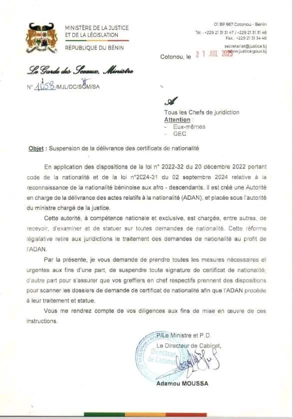 Le ministère de la justice et de la législation a annoncé la suspension de la délivrance des certificats de nationalité au Bénin. Cette décision a été rendue publique le 21 juillet 2025 à travers une note adressée aux chefs de juridiction et signée par le Directeur de cabinet du ministère, Adamou Moussa.Dans le communiqué, il est demandé aux greffiers en chef de prendre des dispositions pour scanner les dossiers de demande de certificat de nationalité afin que l’Adan procède à leur traitement et statue