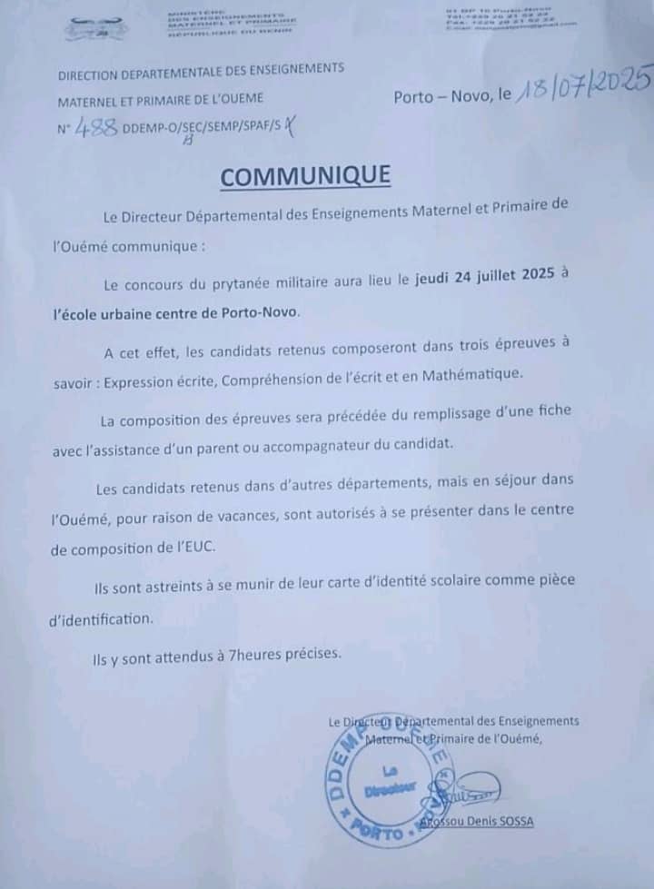 La Direction Départementale des Enseignements Maternel et Primaire de l’Ouémé a annoncé que le concours d’entrée au Prytanée militaire se tiendra le jeudi 24 juillet 2025 à l’École Urbaine Centre (EUC) de Porto-Novo. Les candidats composeront dans trois matières: expression écrite, compréhension de l’écrit et mathématiques. Avant le début des épreuves, ils devront remplir une fiche d’identification, avec l’aide d’un parent ou accompagnateur.