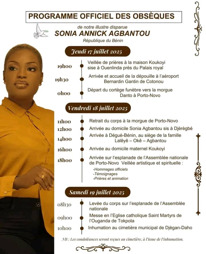 Le programme officiel des obsèques de la journaliste Sonia Annick Agbantou a été dévoilé. L’animatrice émérite sera conduite à sa dernière demeure le samedi 19 juillet 2025. La dépouille sera accueillie à l’aéroport international Bernardin Gantin de Cotonou le jeudi 17 juillet 2025. Une veillée se tiendra le vendredi 18 juillet à partir de 18h sur l’esplanade de l’Assemblée nationale. Le jour de l’inhumation, une messe corps présent sera célébrée à 08h30 à l’Eglise catholique Saint Martyrs de l’Ouganda de Tokpota, suivie de l’inhumation à 10h au cimetière municipal de Djègan-Daho à Porto-Novo.
