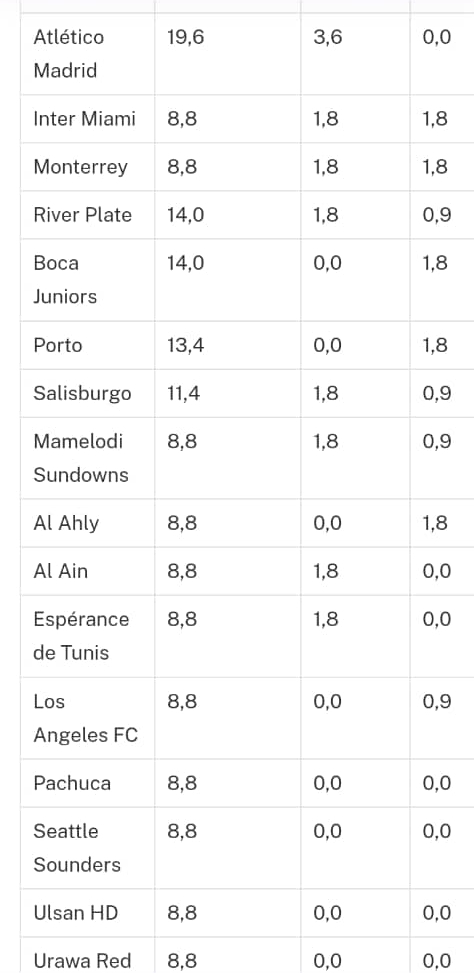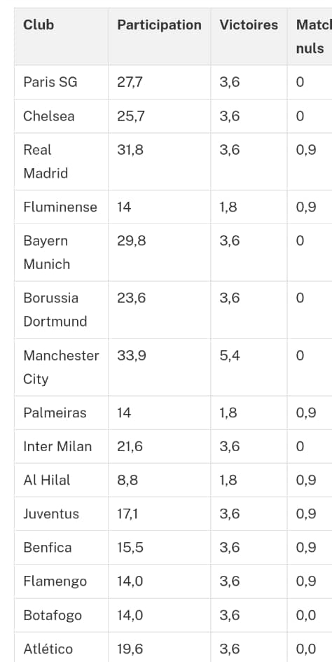 Fluminense représente le meilleur club sud-américain avec 56,2 millions d’euros pour sa qualification en demi-finale. Le Bayern Munich (52,5 millions) et le Borussia Dortmund (47,2 millions) complètent le top 6 malgré leur élimination en quarts de finale.