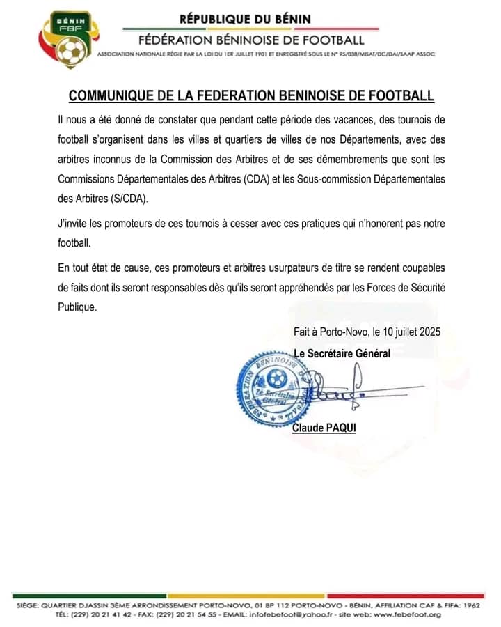 Par le biais d’un communiqué en date de ce jeudi 10 juillet 2025, la Fédération Béninoise de Football (FBF) met en garde contre l’organisation de tournois de vacances faisant appel à des arbitres non accrédités. Les promoteurs de ces compétitions et les arbitres usurpateurs s’exposent à des poursuites s’ils persistent dans ces pratiques contraires aux règlements en vigueur. La FBF rappelle l’importance de respecter les règles et les réglementations pour garantir la crédibilité et la sécurité des compétitions. Les organisateurs et les arbitres sont invités à se conformer aux exigences de la FBF pour éviter toute sanction.