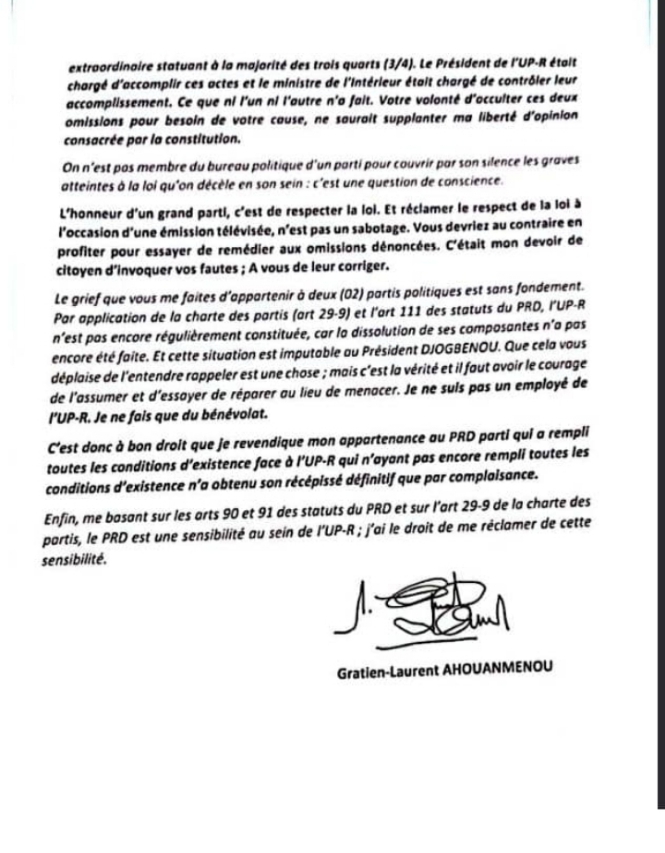 Gratien Ahouanmenou, cadre du parti ex PRD, a adressé une réponse à Gérard Gbénonchi, secrétaire général du parti l’Union Progressiste Le Renouveau. Cette réponse fait suite à une demande d’explications qui lui avait été adressée à la suite de ses récentes interventions médiatiques. Dans une lettre datée du lundi 16 juin 2025, il précise que ses déclarations n’ont en aucun cas été injurieuses, diffamatoires ou incitatrices à la violence. Il reproche au contraire à certains responsables de l’UP Le Renouveau d’avoir laissé prospérer, dans un silence complice, des propos publics dénigrant les fondateurs du parti, notamment le président Adrien Houngbédji. Par ailleurs, concernant la fusion entre le PRD et l’UP, M. Ahouanmenou affirme que les conditions juridiques et statutaires nécessaires à une dissolution effective du PRD ne sont pas réunies. C’est pourquoi, il revendique son appartenance au parti PRD.