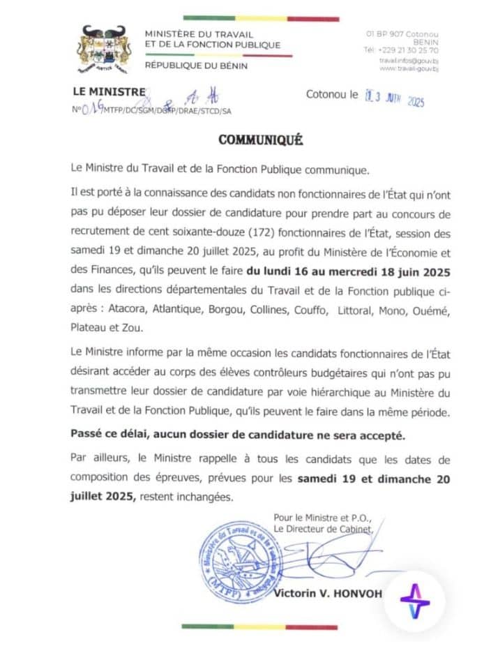 À travers un communiqué en date de ce jeudi 13 Juin 2025, le Ministère du Travail et de la Fonction Publique annonce aux candidats qui ne sont pas fonctionnaires de l’État et qui n’ont pas réussi à soumettre leurs dossiers pour le concours de recrutement de 172 élèves fonctionnaires au Ministère de l’Economie et des Finances qu’ils auront la possibilité de le faire entre le lundi 16 et le mercredi 18 juin 2025. Les fonctionnaires de l’État souhaitant participer à ce même concours pourront également soumettre leurs candidatures durant cette même période. De plus, le communiqué indique que les dates pour les épreuves, fixées au samedi 19 et au dimanche 20 juillet, restent les mêmes.