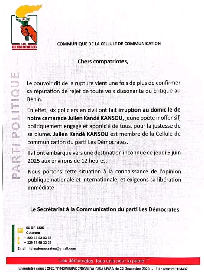 Julien Kandé Kansou, un militant engagé du parti d’opposition « Les Démocrates » n’est plus libre de ses mouvements. Ce jeudi 05 juin 2025, il a été appréhendé à son domicile par six agents de police aux alentours de midi, qui l’ont ensuite emmené vers un lieu inconnu selon le communiqué du secrétariat à la communication du parti Les Démocrates. Le parti dirigé par l’ancien président Yayi Boni fustige un climat de répression politique et accuse le régime en place de tenter de faire taire les voix dissidentes. Il réclame la libération immédiate de son membre et interpelle l’opinion publique, tant nationale qu’internationale, sur ce qu’il décrit comme une atteinte aux libertés fondamentales.