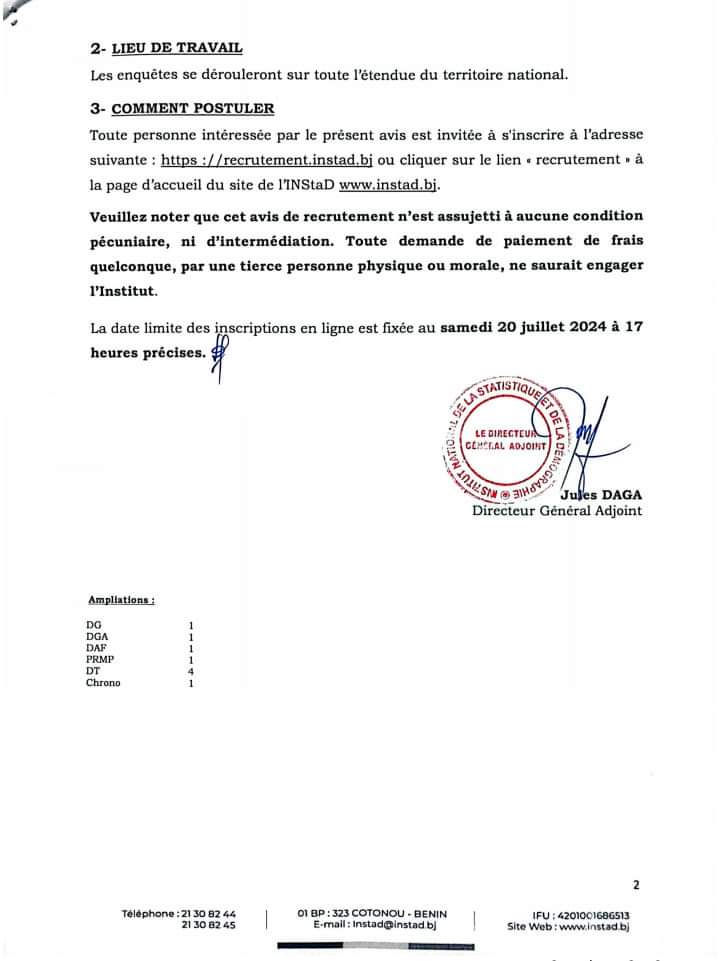 Collecte et traitement de données sur le terrain: L’INStaD, ex-INSAE lance un recrutement pour constituer une base d’agents