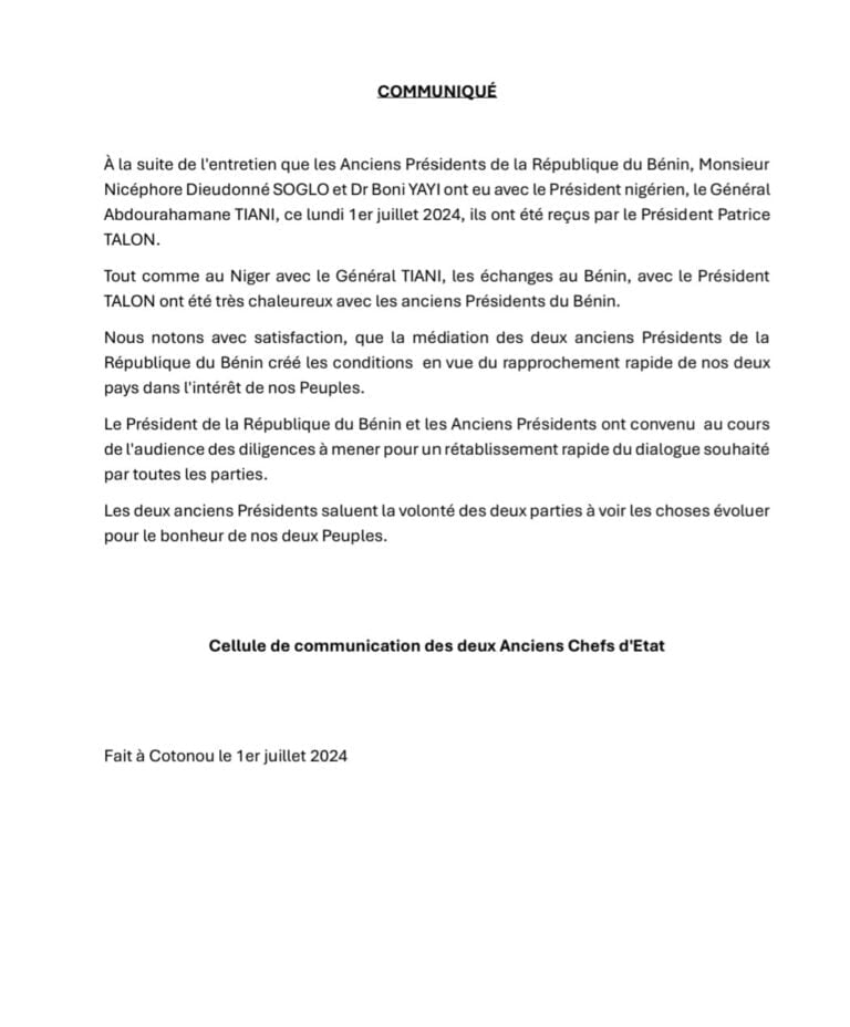 Les discussions ont été certainement riches au cours de l’ audience au palais de la Marina ce lundi 1er juillet 2024 entre Patrice Talon et ses prédécesseurs. Le communiqué rendu public par la Cellule de communication des anciens présidents de la République, Nicéphore Dieudonné Soglo et Boni Yayi, après la rencontre avec leur successeur, souligne que les trois personnalités ont convenu « des diligences à mener pour un rétablissement rapide du dialogue souhaité par toutes les parties ». Ce qui prouve que des jalons ont été jetés. Lire le communiqué ci-dessous.